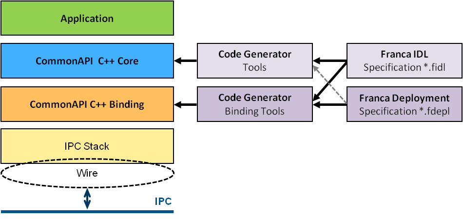 vsomeip是SOME/IP规范的开源实现,作为COVESA项目的一部分设计。同时COVESA开发了CommonAPI C++的一套库和工具,方便开发者快速定义和实现IPC/RPC通信接口并基于vsomeip进行符合SOME/IP规范的通信